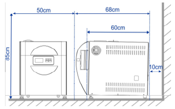 Der Autoklav ist grundsätzlich für einen unabhängigen Betrieb ohne Anschluss an Ver- oder Entsorgungsleitungen vorgesehen. Der Dampferzeuger speist sich aus dem in das Gerät integrierten Vorratstank, dieser wird über eine gut zugängliche Einfüllöffnung auf der Oberseite des Autoklavs manuell befüllt. Das anfallende Kondensat wird in einer zweiten Kammer der Tanks gesammelt und manuell über eine Anschluss an der Vorderseite des Gerätes entsorgt. Ein fester Anschluss ein einen VE-Wasseranschluss ist auf Wunsch möglich.